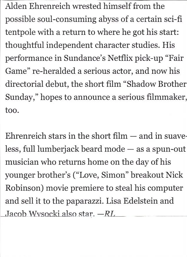 Written and directed by Alden Ehrenreich with executive producer Francis Ford Coppola, it’s the story of a down-on-his-luck musician who returns home on the day of his younger brother’s movie premiere to steal his computer and sell it to the paparazzi. A visceral depiction of family dynamics and complexities, it is a deeply moving story, and thanks to the brilliance of the ensemble cast it’s on its way to even more recognition. It’s been an honor to be a part of it.